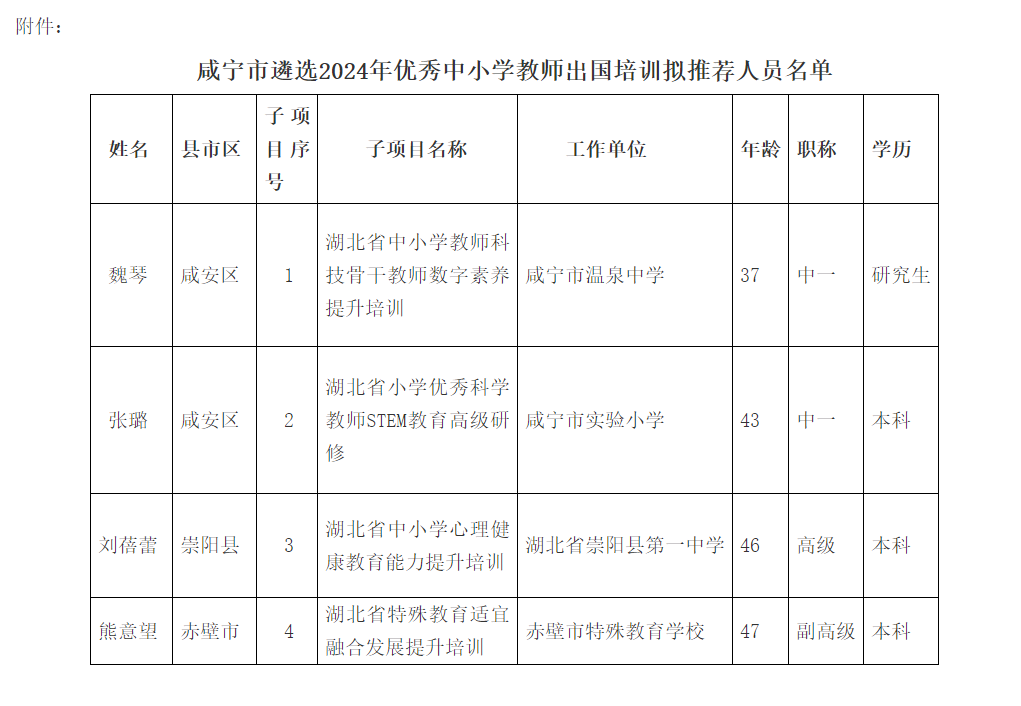 根據(jù)《省教育廳辦公室關(guān)于遴選2024年優(yōu)秀中小學(xué)幼教師出國培訓(xùn)的通知》要求,經(jīng)個(gè)人申報(bào)、組織推薦和審核等程序,確定魏琴等4位為咸寧市2024年優(yōu)秀中小學(xué)教師出國培訓(xùn)擬推薦人員,現(xiàn)予以公示。公示期間如有異議,請向咸寧市教育局教師管理科反映。