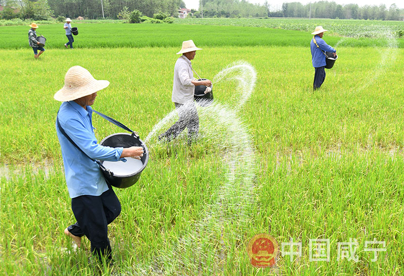 7月29日,嘉魚(yú)縣陸溪鎮(zhèn)官洲村,村民為補(bǔ)種的中稻施肥。