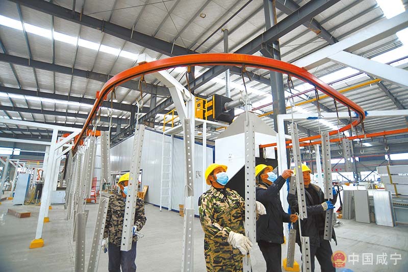 2月10日,通山縣經(jīng)濟(jì)開發(fā)區(qū)科奧工業(yè)園瑞興鋁塑模板二期廠房生產(chǎn)車間,工人正在將鋁板掛至自動(dòng)噴涂線上。