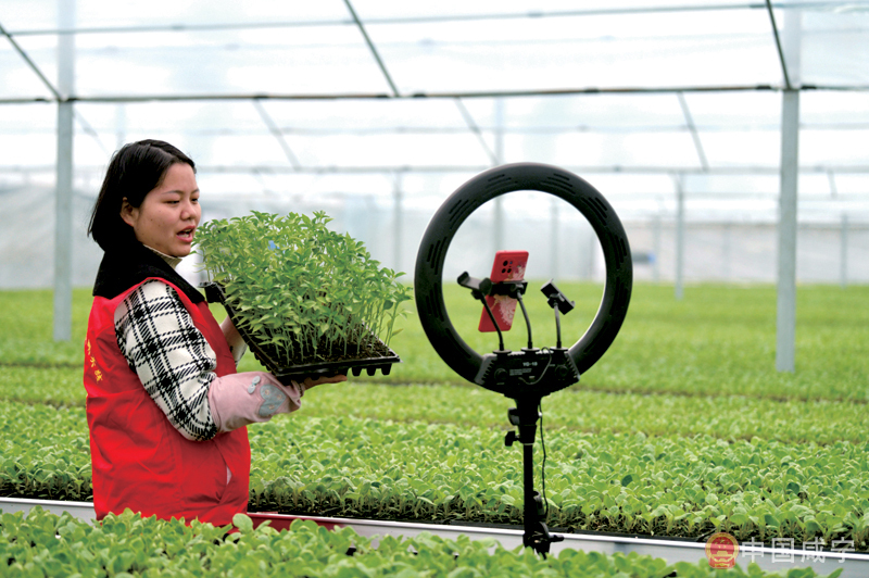 2月17日,在通城縣北港鎮(zhèn)莊前村綠康蔬菜集約化育苗基地大棚內(nèi),當(dāng)?shù)鼐W(wǎng)紅直播銷(xiāo)售辣椒、茄子苗。