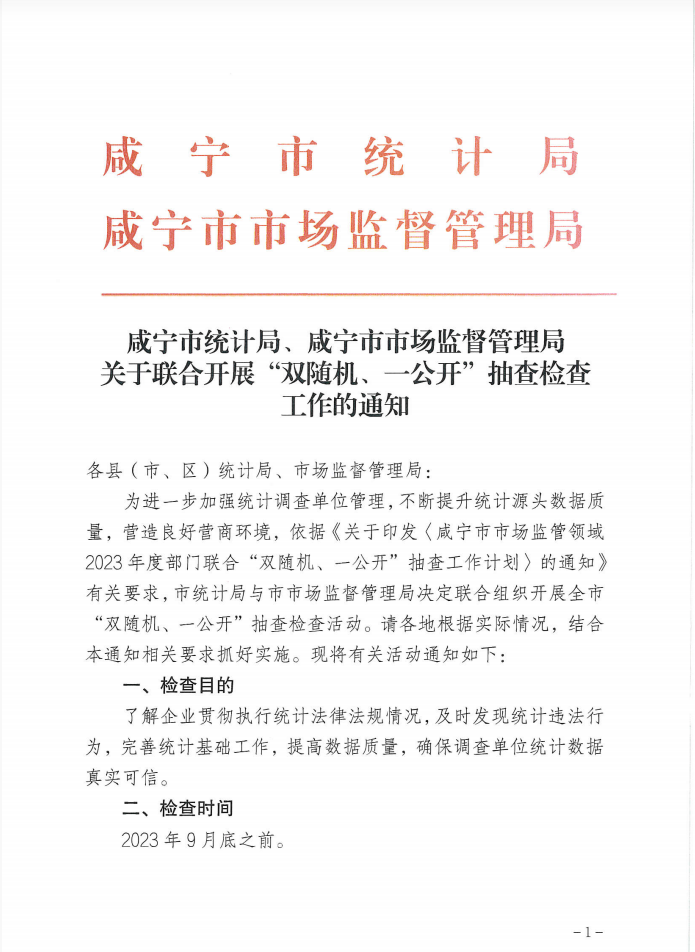 咸寧市統(tǒng)計(jì)局、咸寧市市場(chǎng)監(jiān)督管理局關(guān)于聯(lián)合開(kāi)展“雙隨機(jī)、一公開(kāi)”抽查檢查工作的通知