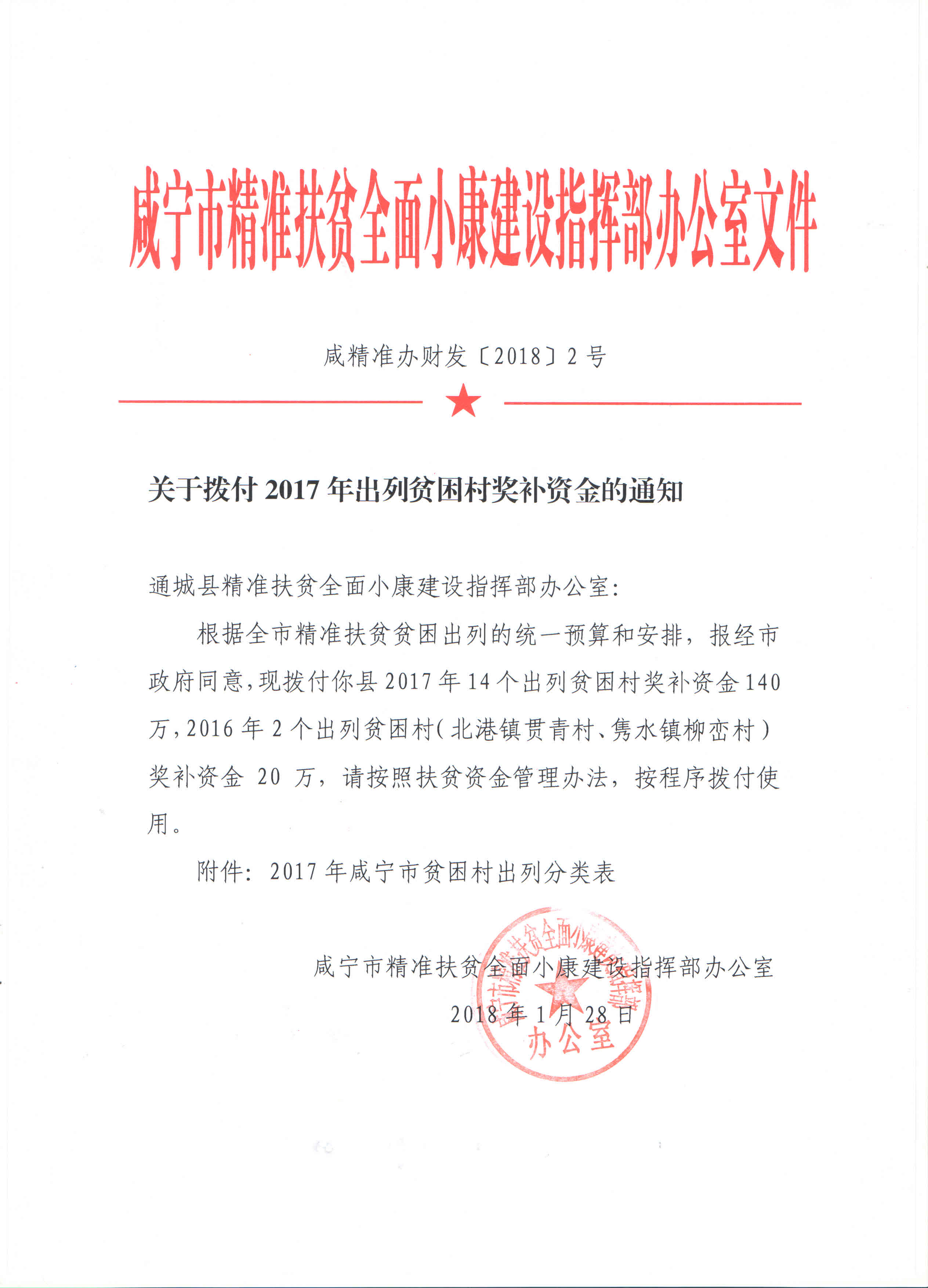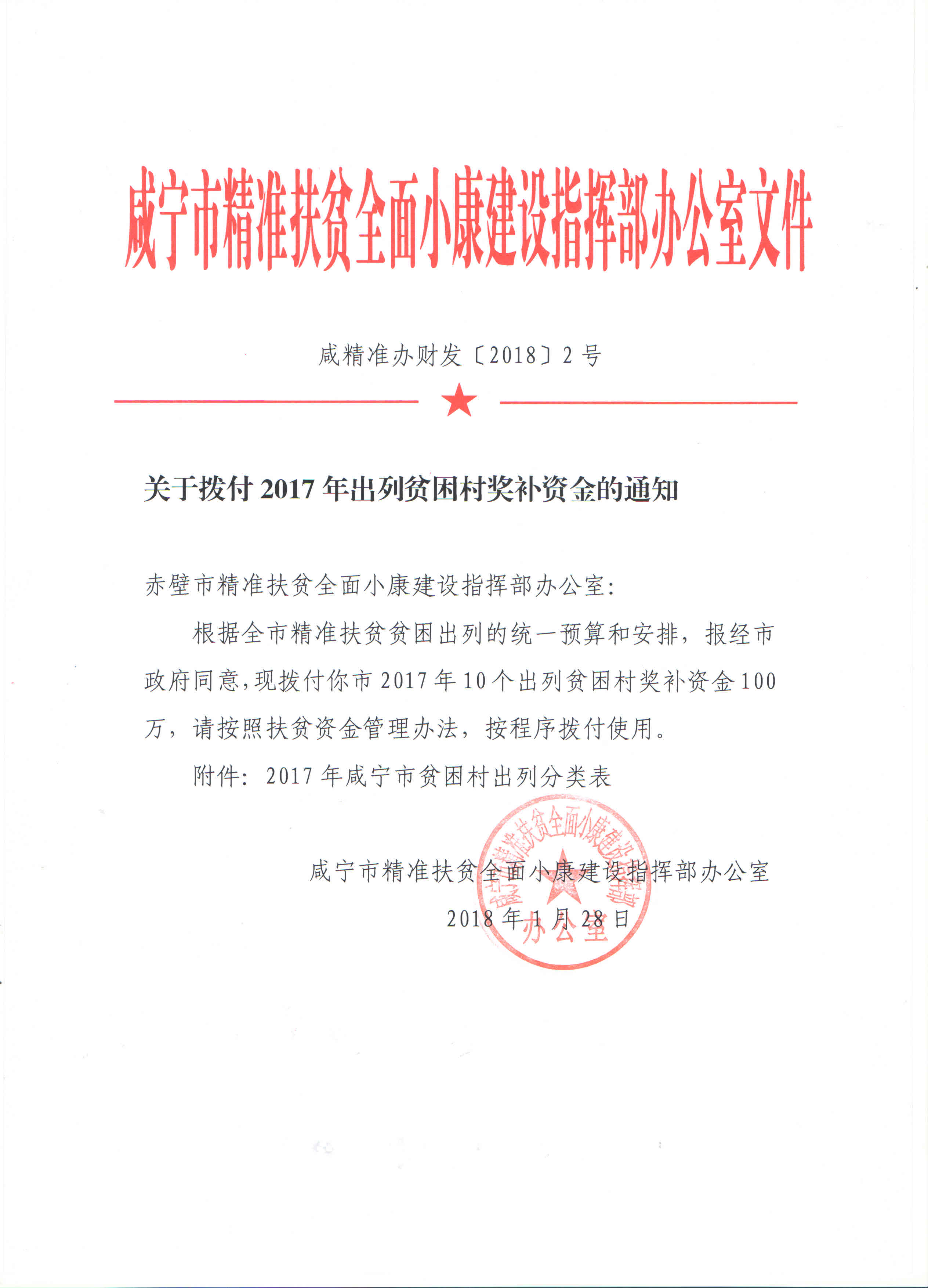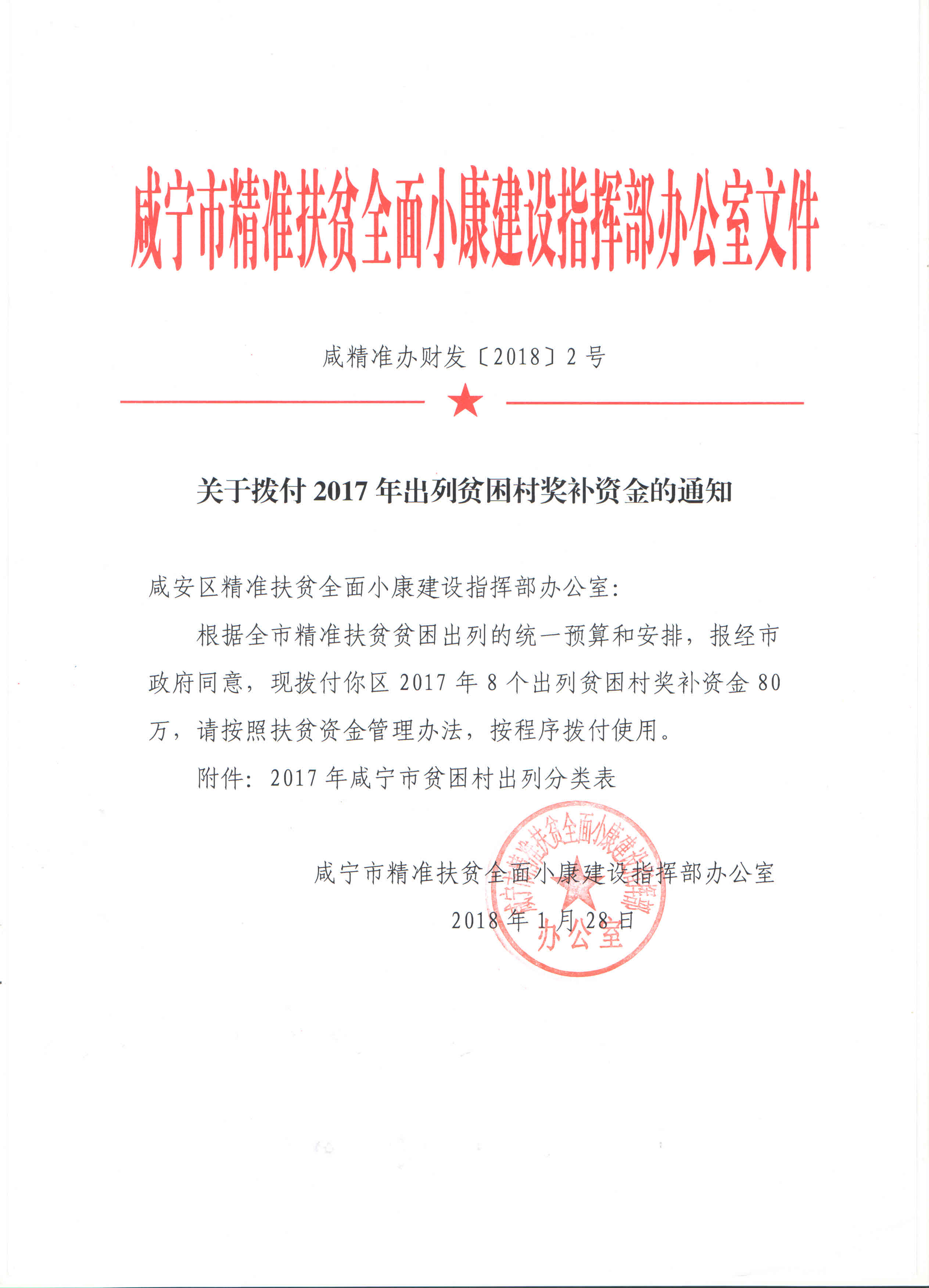 咸精準(zhǔn)辦財(cái)發(fā)〔2018〕2號(hào)關(guān)于撥付2017年出列貧困村獎(jiǎng)補(bǔ)資金的通知