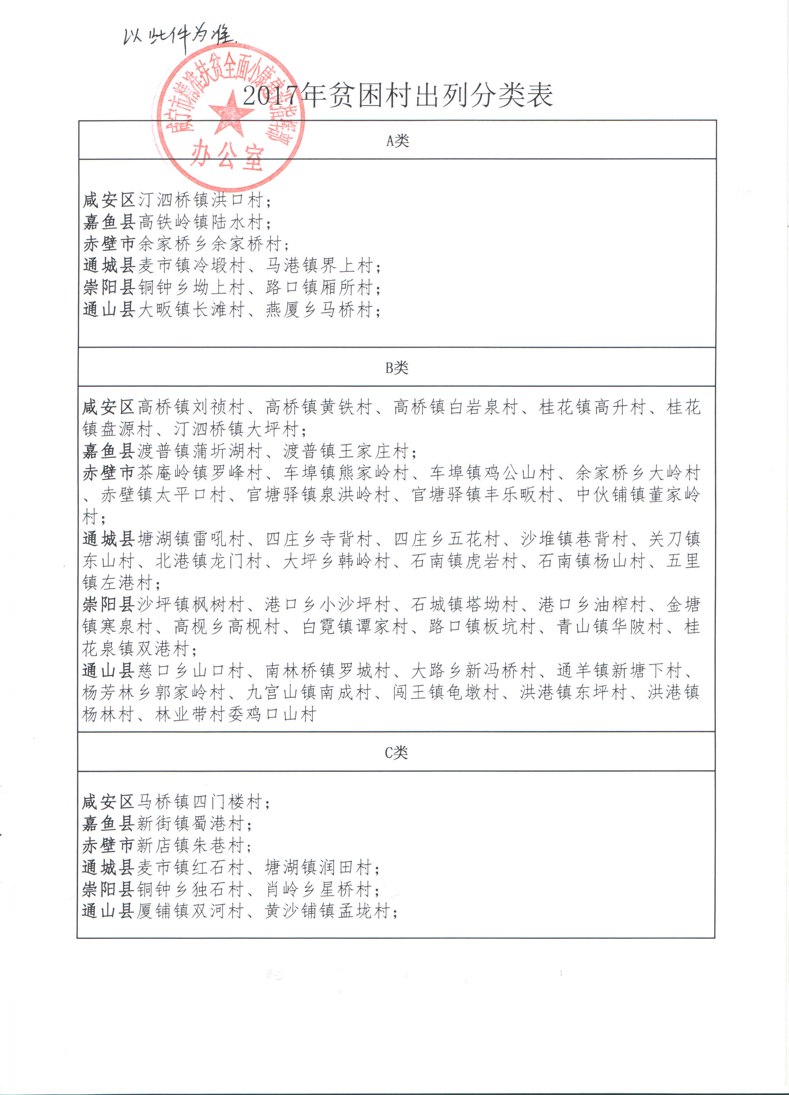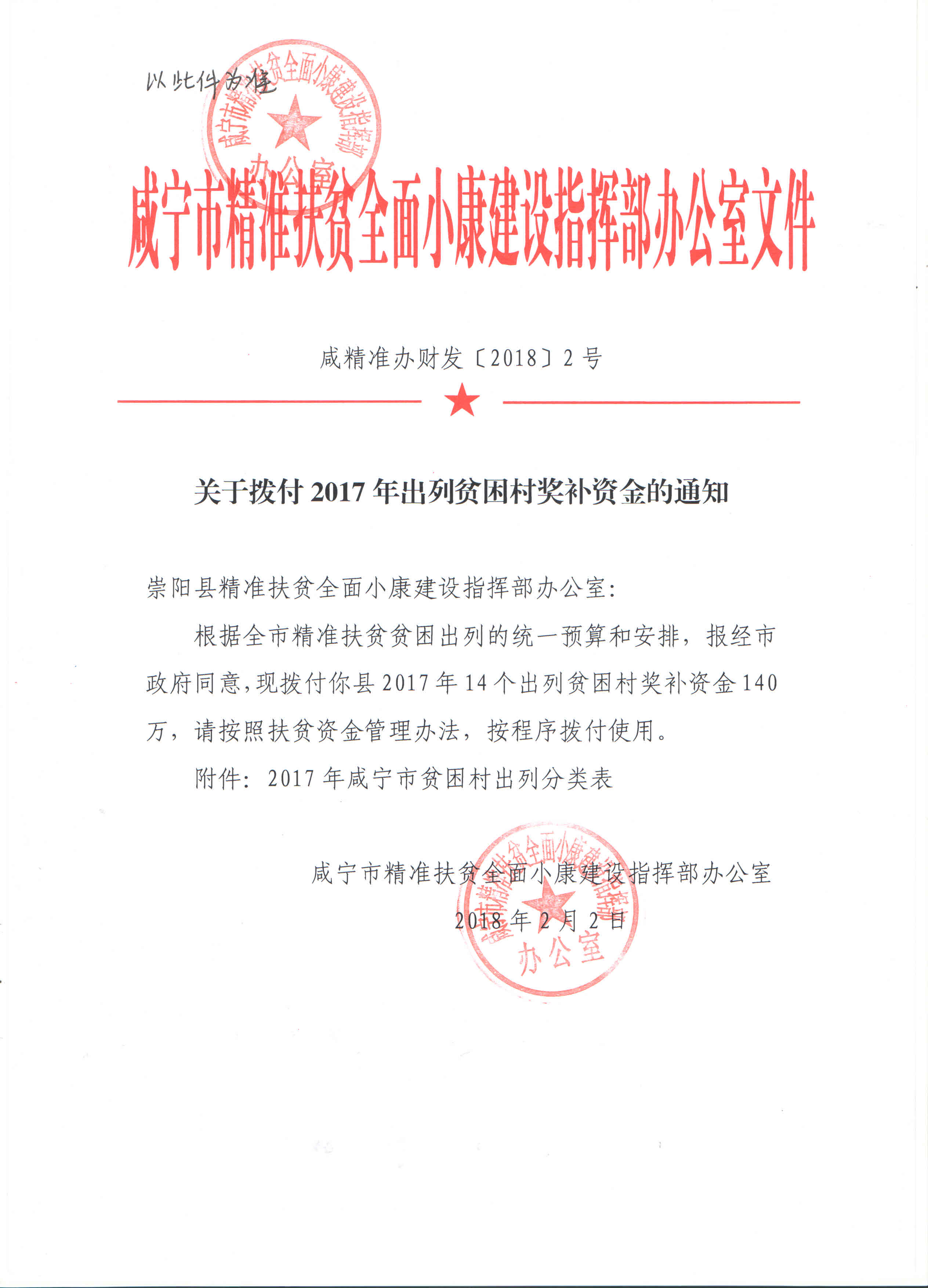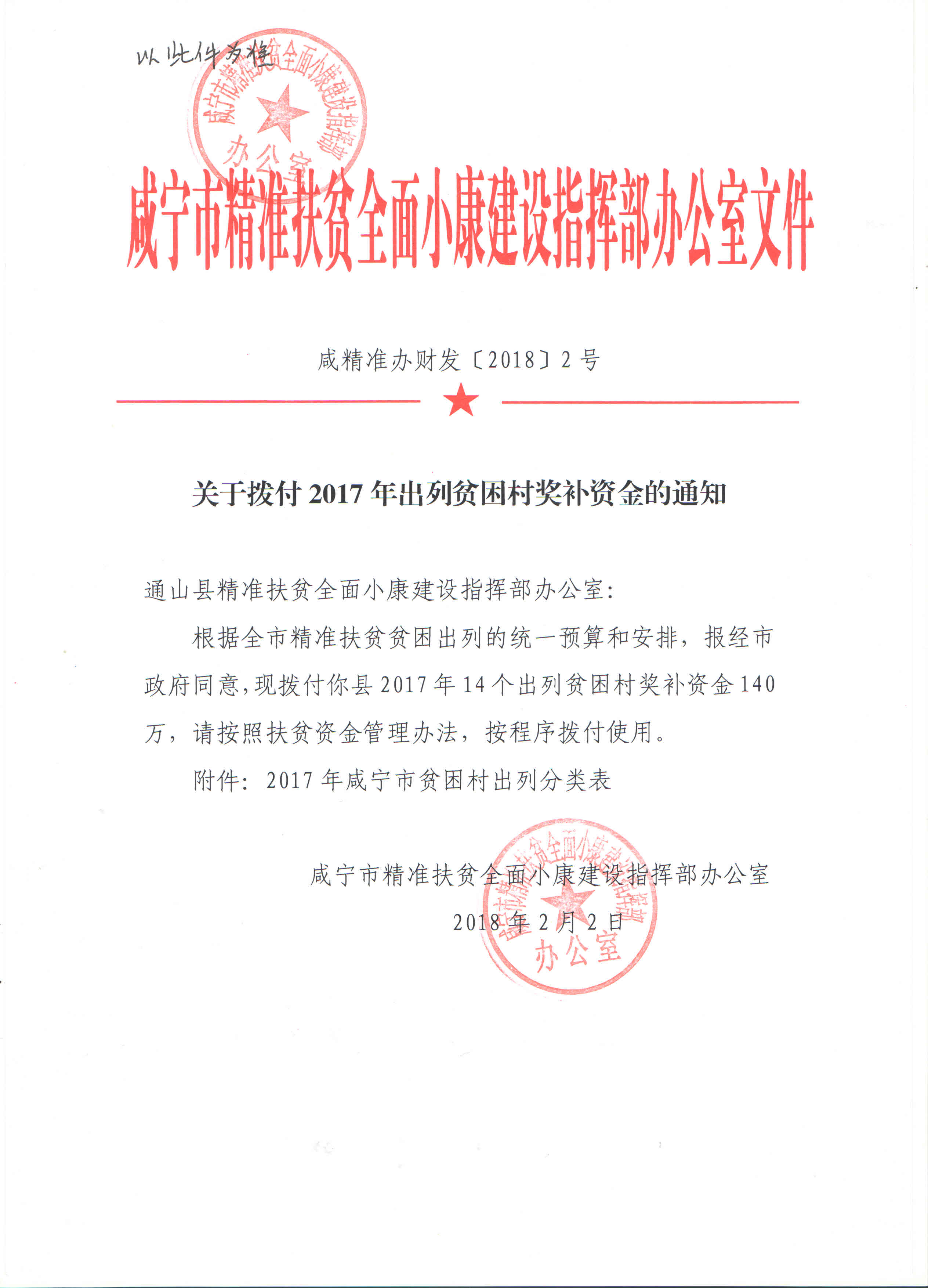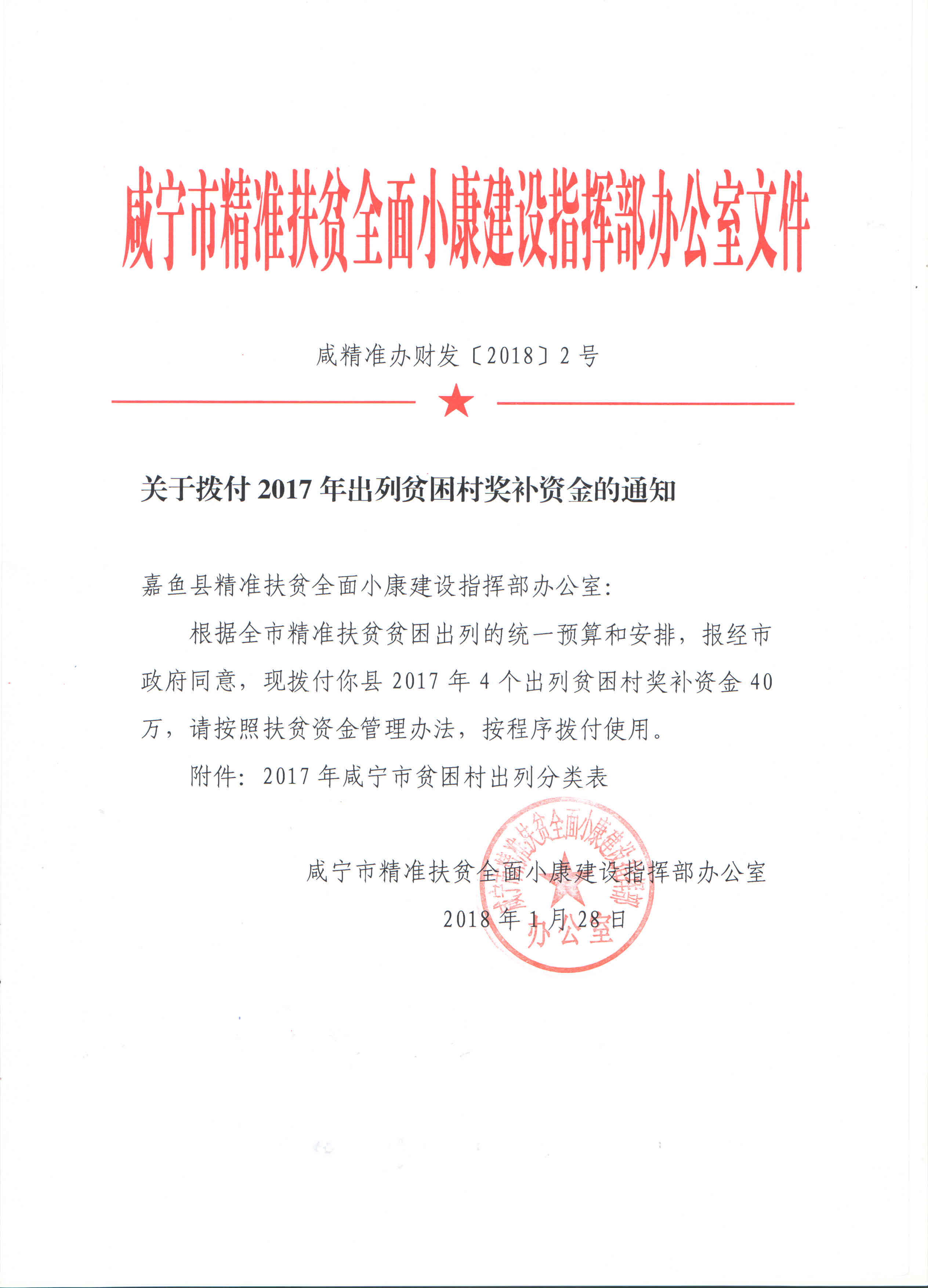 咸精準(zhǔn)辦財(cái)發(fā)〔2018〕2號(hào)關(guān)于撥付2017年出列貧困村獎(jiǎng)補(bǔ)資金的通知