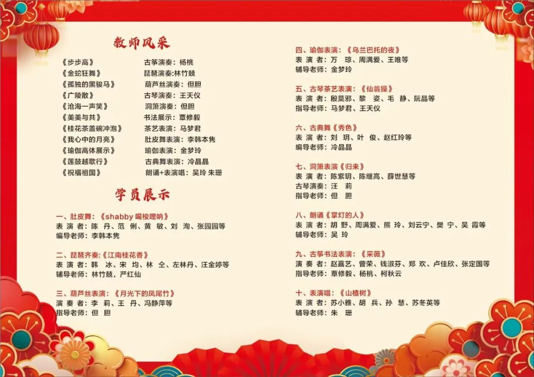 結(jié)合陣地服務(wù)特色,對成人公益培訓(xùn)春秋兩季的古琴、舞蹈、朗誦、瑜伽、古箏、書法、茶藝、琵琶、葫蘆絲、洞簫、東方舞、聲樂等12門課程的教學(xué)成果進行展示。