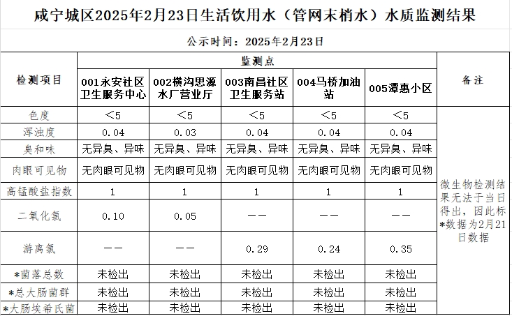 2025年2月23日咸寧城區(qū)生活飲用水監(jiān)測(cè)結(jié)果公示