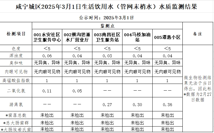 2025年3月1日咸寧城區(qū)生活飲用水監(jiān)測(cè)結(jié)果公示