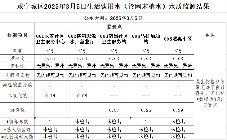 2025年3月5日咸寧城區(qū)生活飲用水監(jiān)測結果公示