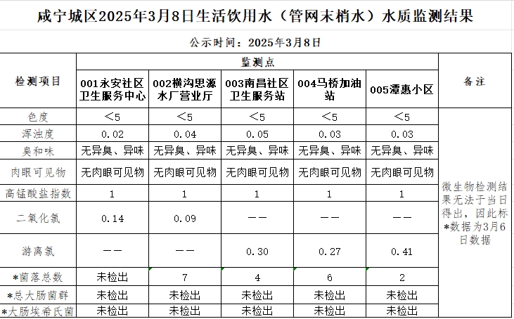 2025年3月8日咸寧城區(qū)生活飲用水監(jiān)測(cè)結(jié)果公示