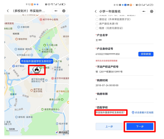 點(diǎn)擊“確定”,跳轉(zhuǎn)至地圖,查看系統(tǒng)為您匹配的校區(qū)(匹配規(guī)則:系統(tǒng)根據(jù)房產(chǎn)地址、片區(qū)規(guī)劃、購房年限數(shù)據(jù)篩選校區(qū),如您對匹配學(xué)校有疑問,請?zhí)顚懯醉摗肮k學(xué)校報名登記表”、“民辦學(xué)校報名登記表”,打印后攜帶至相應(yīng)學(xué)?,F(xiàn)場審核報名),點(diǎn)擊學(xué)校圖標(biāo),系統(tǒng)跳轉(zhuǎn)回報名頁,點(diǎn)擊“下一步”,點(diǎn)擊“確定”。