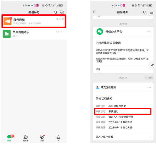 審核通過后,系統(tǒng)將“審核狀態(tài)通知”推送至微信服務(wù)通知,持小程序“審核通過”通知到學(xué)?,F(xiàn)場審核,領(lǐng)取入學(xué)通知書。