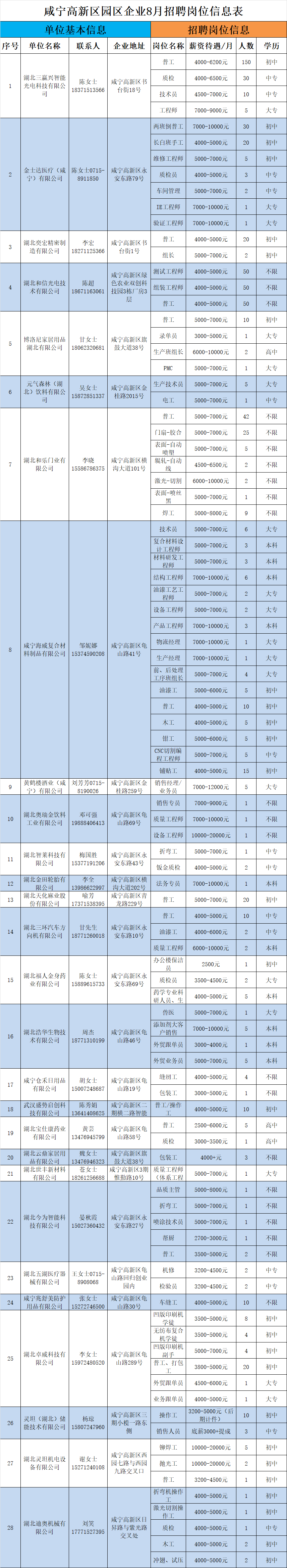 咸寧高新區(qū)園區(qū)企業(yè)8月招聘信息(附崗位表)