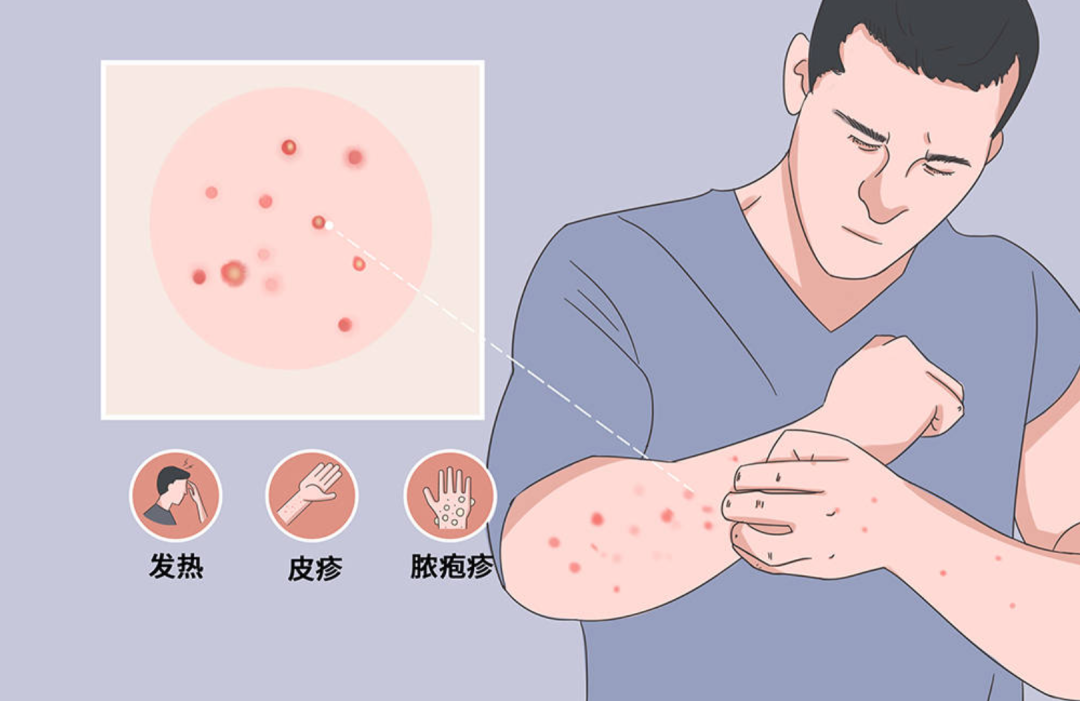 發(fā)病早期一般出現(xiàn)寒戰(zhàn)、發(fā)熱,同時可能伴有頭痛、嗜睡、乏力等癥狀,多數(shù)患者會出現(xiàn)腹股溝淋巴結(jié)腫大。一般發(fā)病后1-3天出現(xiàn)皮疹。皮疹一般以面部和四肢皮疹更為多見,手心、腳掌、口腔黏膜、生殖器等部位都有可能出現(xiàn)皮疹。