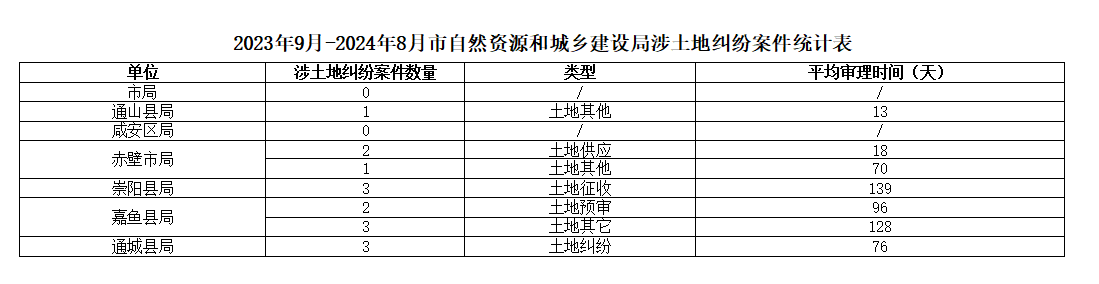 2023年9月-2024年8月,全市自然資源系統(tǒng)已審結(jié)的涉土地糾紛案件共17件。按照案件類型分類,土地預審類2件,土地供應類2件,土地征收類5件,土地其他類8件。平均辦理天數(shù)(平均解決時間)95.06天。