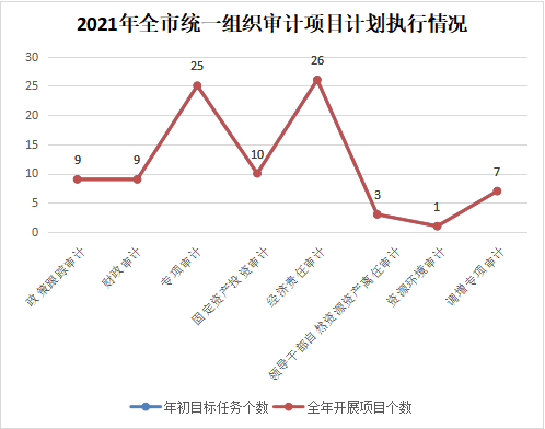 2021年我局按照《咸寧市2021年度統(tǒng)一組織審計(jì)項(xiàng)目計(jì)劃》安排,制定全市統(tǒng)一組織審計(jì)項(xiàng)目83個(gè),因省廳統(tǒng)一調(diào)整增加公共停車收費(fèi)審計(jì)項(xiàng)目7個(gè),調(diào)整后審計(jì)項(xiàng)目90個(gè),其中:政策跟蹤審計(jì)項(xiàng)目9個(gè),財(cái)政審計(jì)項(xiàng)目9個(gè),專項(xiàng)審計(jì)項(xiàng)目32個(gè)(含調(diào)整專項(xiàng)審計(jì)7個(gè)),投資審計(jì)項(xiàng)目10個(gè),經(jīng)濟(jì)責(zé)任審計(jì)項(xiàng)目26個(gè),領(lǐng)導(dǎo)干部自然資源資產(chǎn)離任審計(jì)項(xiàng)目3個(gè),資源環(huán)境審計(jì)1個(gè)。全年審計(jì)項(xiàng)目執(zhí)行情況如下: