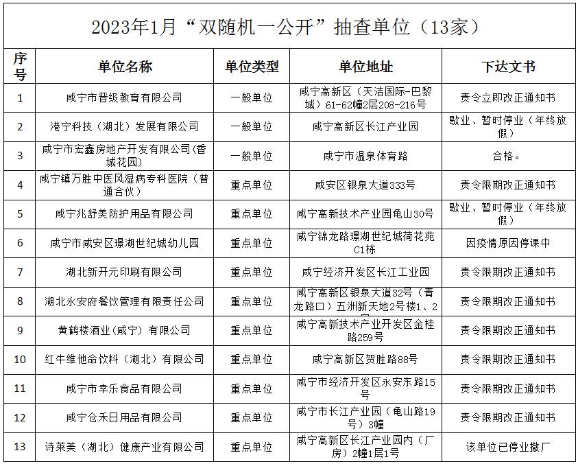 根據(jù)“雙隨機、一公開”消防監(jiān)管工作要求,咸寧高新技術(shù)產(chǎn)業(yè)開發(fā)區(qū)消防救援大隊現(xiàn)將“雙隨機、一公開”2023年2月份抽查名單,2023年1月份檢查結(jié)果公示如下: