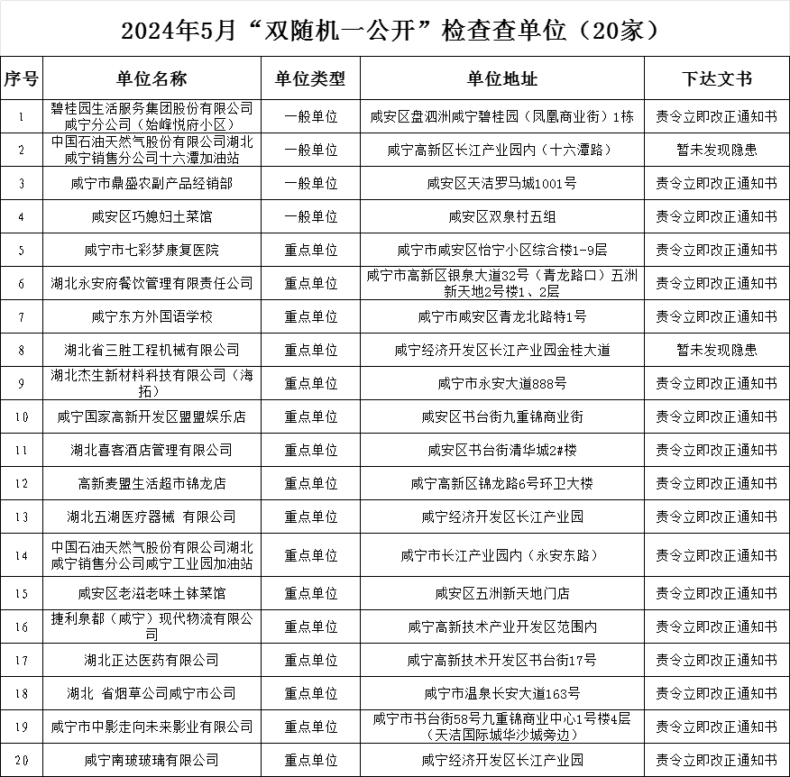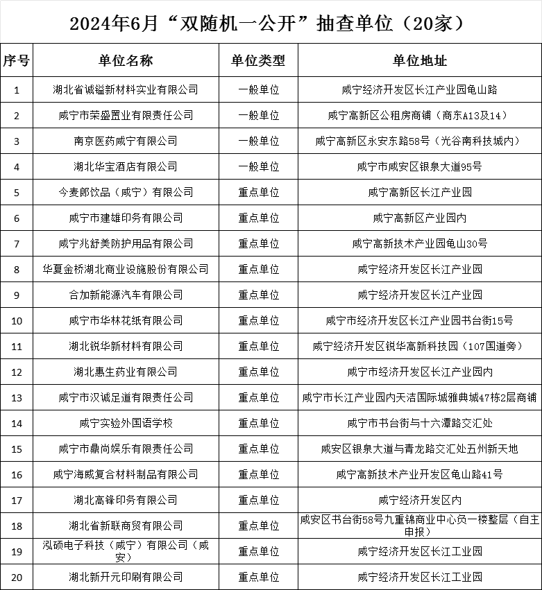 根據(jù)“雙隨機(jī)、一公開”消防監(jiān)管工作要求,咸寧高新技術(shù)產(chǎn)業(yè)開發(fā)區(qū)消防救援大隊現(xiàn)將“雙隨機(jī)、一公開”2024年6月份抽查名單,2023年5月份檢查結(jié)果公示如下: