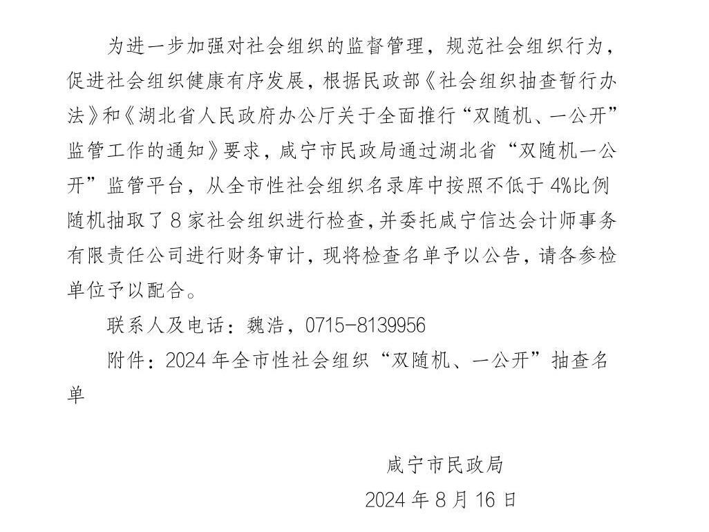 2024年全市性社會組織“雙隨機、一公開” 抽查檢查名單公告