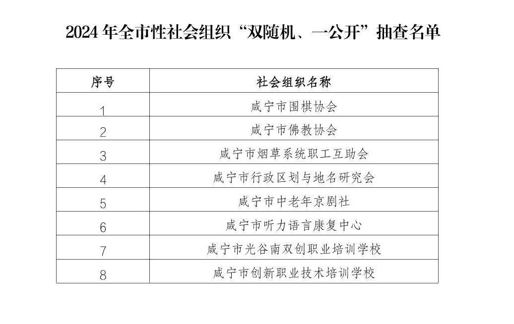 • 名  稱:2024年全市性社會組織“雙隨機、一公開” 抽查檢查名單公告