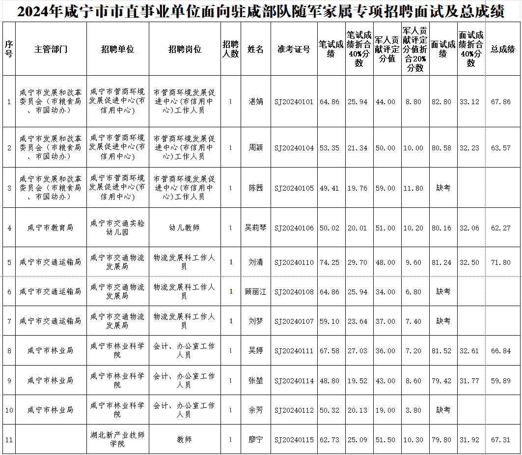 2024年咸寧市市直事業(yè)單位面向駐咸部隊(duì)隨軍家屬專項(xiàng)招聘面試工作已結(jié)束,現(xiàn)將面試及綜合成績(jī)予以公布。
