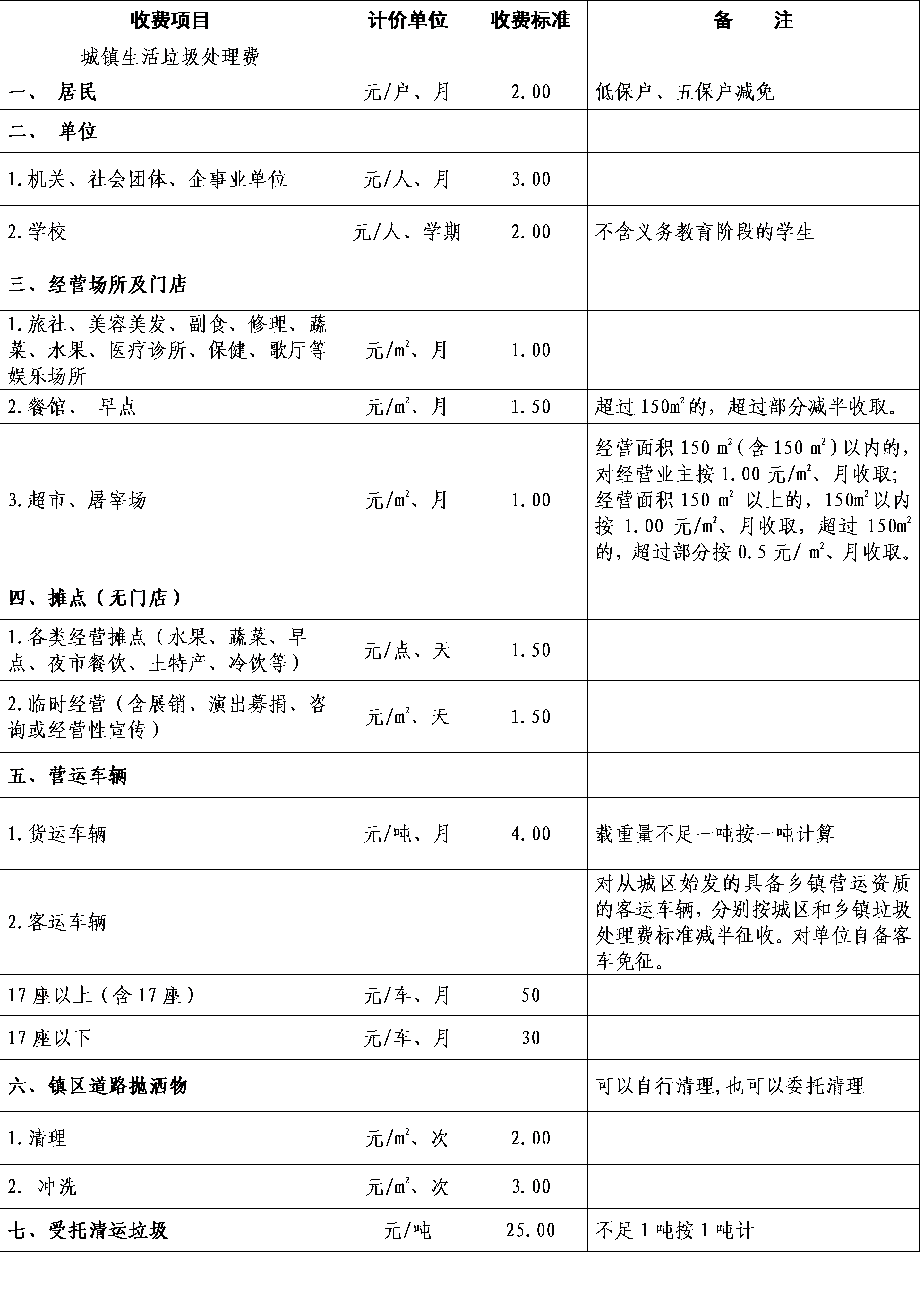 一、同意橫溝橋鎮(zhèn)向集鎮(zhèn)居民、單位、經(jīng)營場所及門店、攤點(diǎn)(無門店)等征收生活垃圾處理費(fèi),具體收費(fèi)項(xiàng)目、收費(fèi)對象、收費(fèi)標(biāo)準(zhǔn)、計價單位及減免規(guī)定詳見附表。