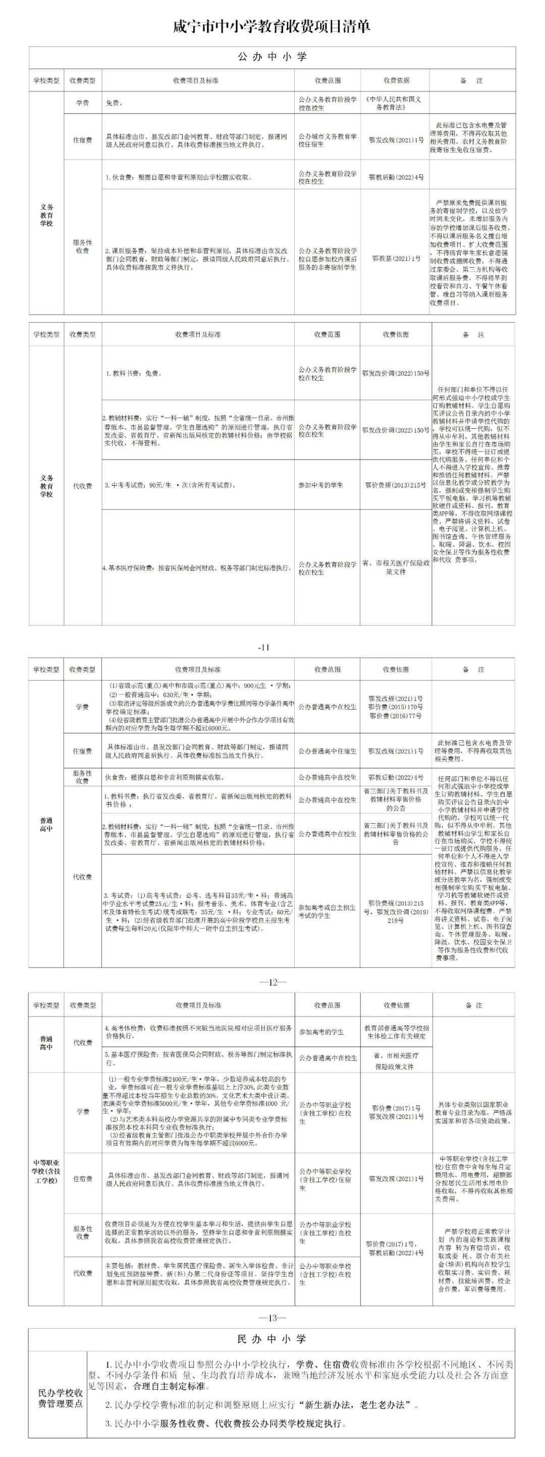 為進一步規(guī)范教育收費行為,切實維護學(xué)校和學(xué)生的合法權(quán)益,省發(fā)改委等五部門印發(fā)了《關(guān)于進一步加強中小學(xué)教育收費管理的通知》(鄂發(fā)改價調(diào)〔2024〕46號),確定中小學(xué)教育收費項目為學(xué)費、住宿費、服務(wù)性收費和代收費四大項目,覆蓋義務(wù)教育學(xué)校、普通高中和中等職業(yè)學(xué)校(含技工學(xué)校)。當前咸寧市中小學(xué)教育收費項目清單具體如下: