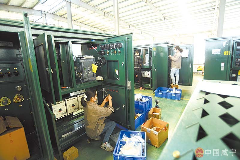 4月8日,咸寧市凱源鑫盛電氣有限公司,工人在車間進(jìn)行二次接線。
