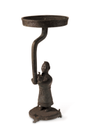 生活用具。由燈盤(pán)、曲柄、銅人組成。燈盤(pán)方唇,直腹,平底。銅人左手托飛鳥(niǎo),右手擎燈,頭挽右髻,深衣,博帶,發(fā)、須、眉刻畫(huà)入微,深衣下部飾勾連云紋。燈座以三只尖嘴銅鳳鳥(niǎo)為足,表面飾龍紋。楚墓出土有人騎駱駝燈、跽坐人擎燈,直立人擎燈尚屬少見(jiàn)。