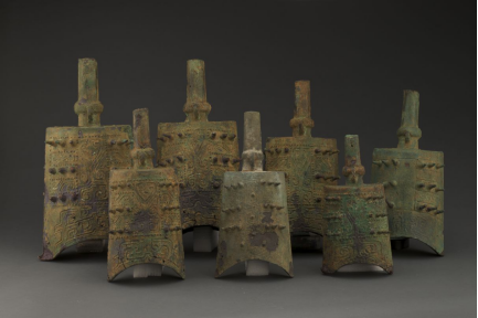 樂(lè)器。弧于,直口,有柱狀甬。甬上細(xì)下粗,有旋斡。器表鑄有長(zhǎng)枚,鉦部飾鼓部和篆間飾竊曲紋、乳釘紋。此套編鐘為窖藏出土,出土?xí)r,較大的四件鐘鐘口相對(duì),三件小鐘分置其中,同出尚有鼎、戈、矛、斧等7件。